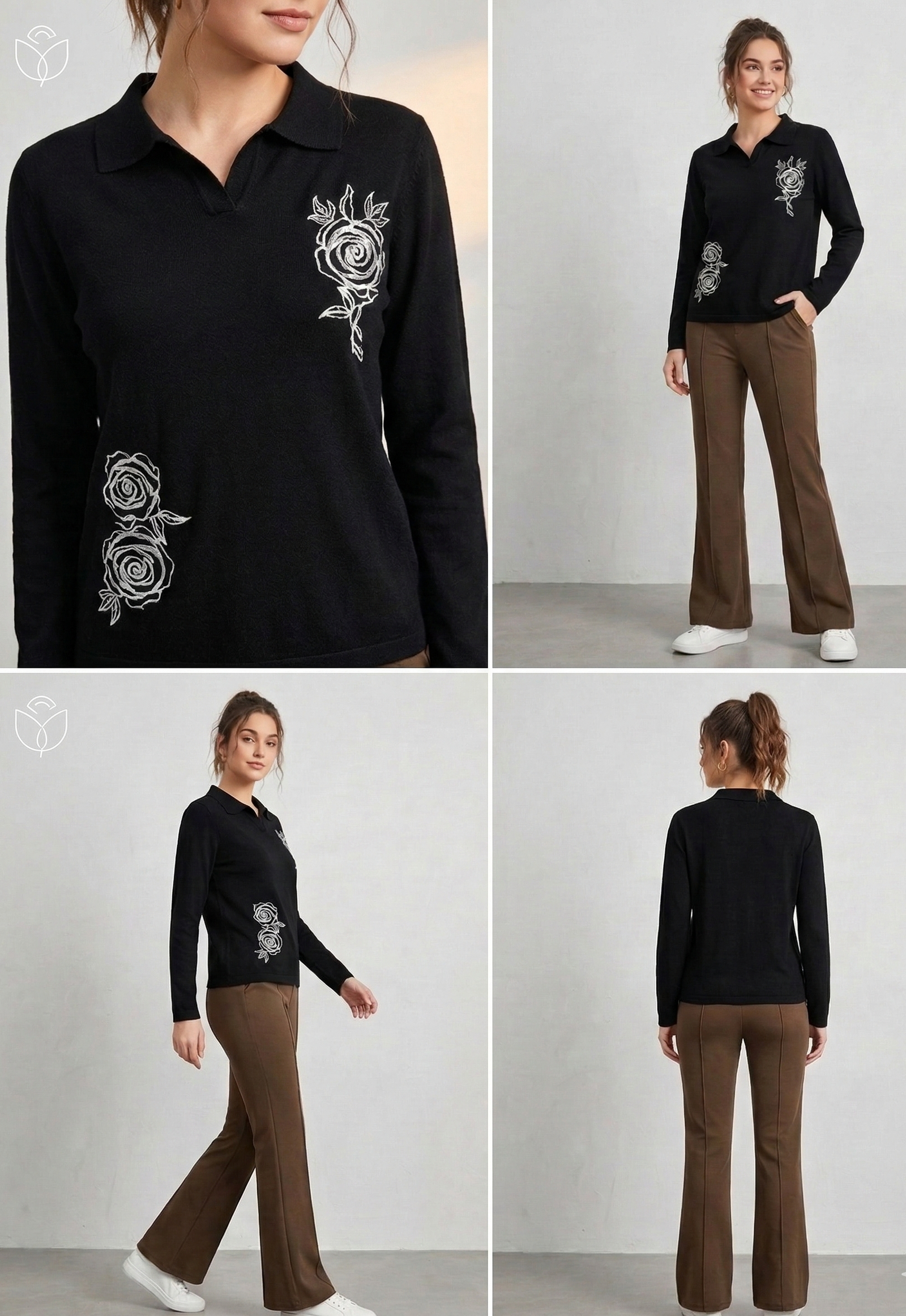 The Top: A premium black knit long-sleeve polo shirt featuring a classic collar and a deep V-neckline. The highlight is the minimalist white rose embroidery placed artistically on the chest and hip, adding a touch of feminine elegance to the dark base.