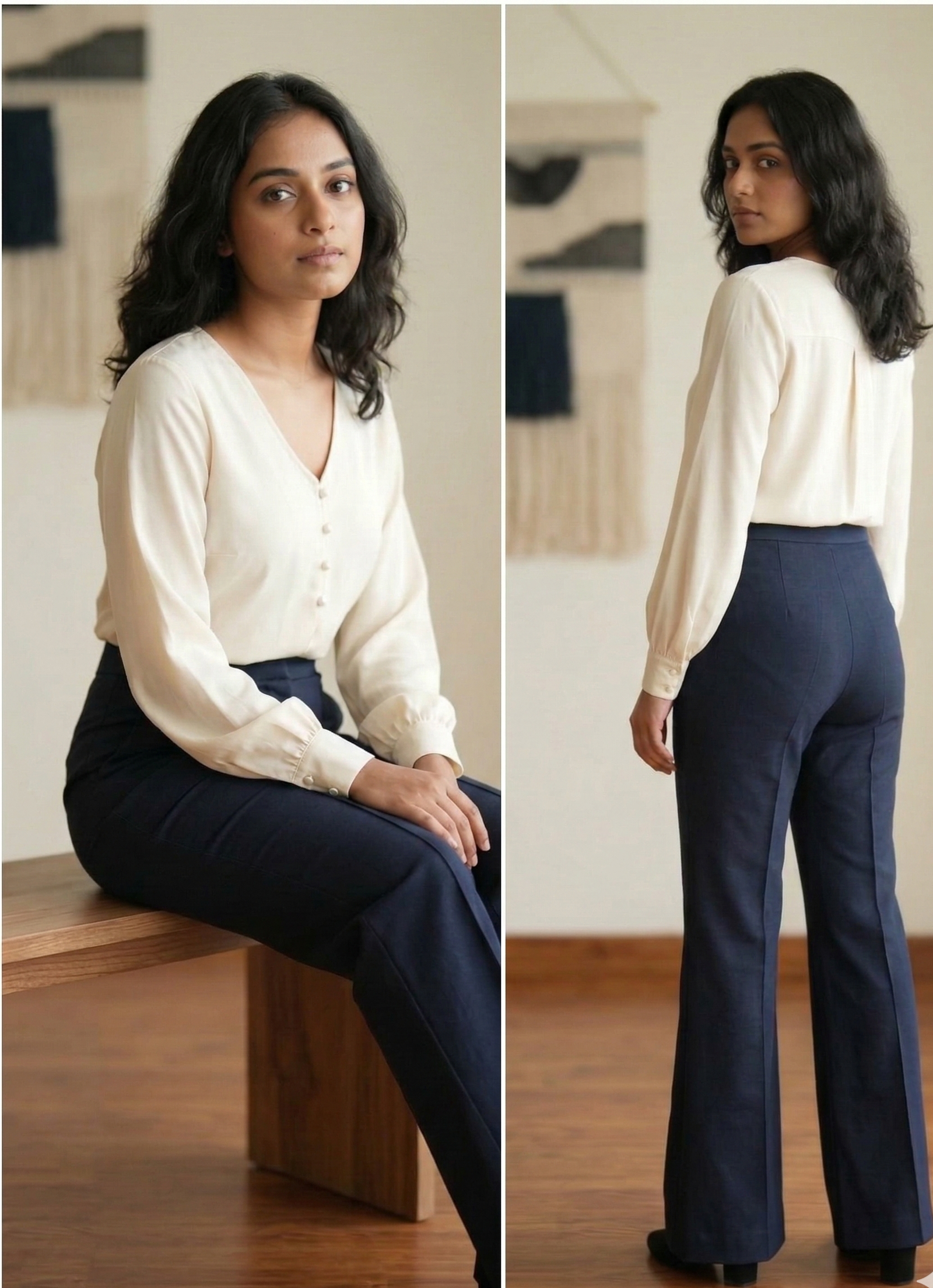 Overview: Step out in timeless sophistication with our curated set, featuring the Ivory Pearl Button Blouse and Navy Flared Trousers. Designed for the modern woman who values effortless style, this duo offers a powerful and polished silhouette suitable for office-to-evening transitions, formal meetings, or sophisticated casual events.