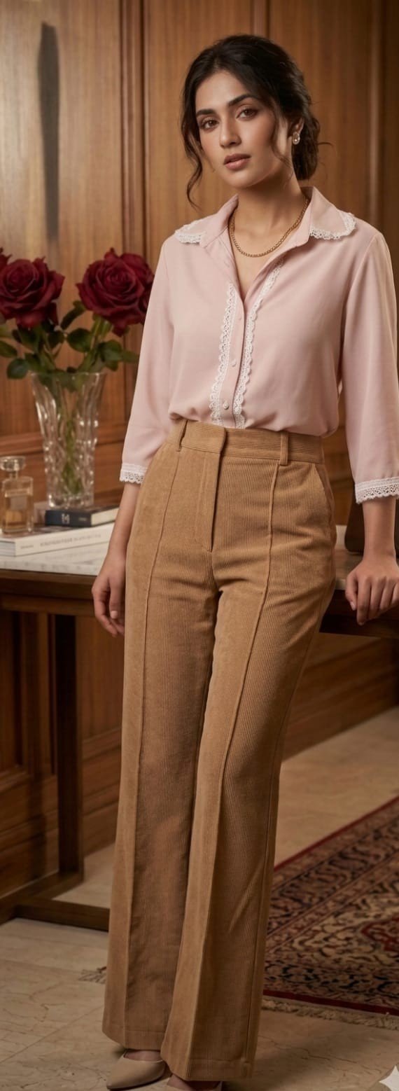 The Trousers: High-waisted trousers made from premium corduroy in a versatile tan shade. Designed with a structured wide-leg silhouette and front-seam detailing to provide a tall, flattering frame.